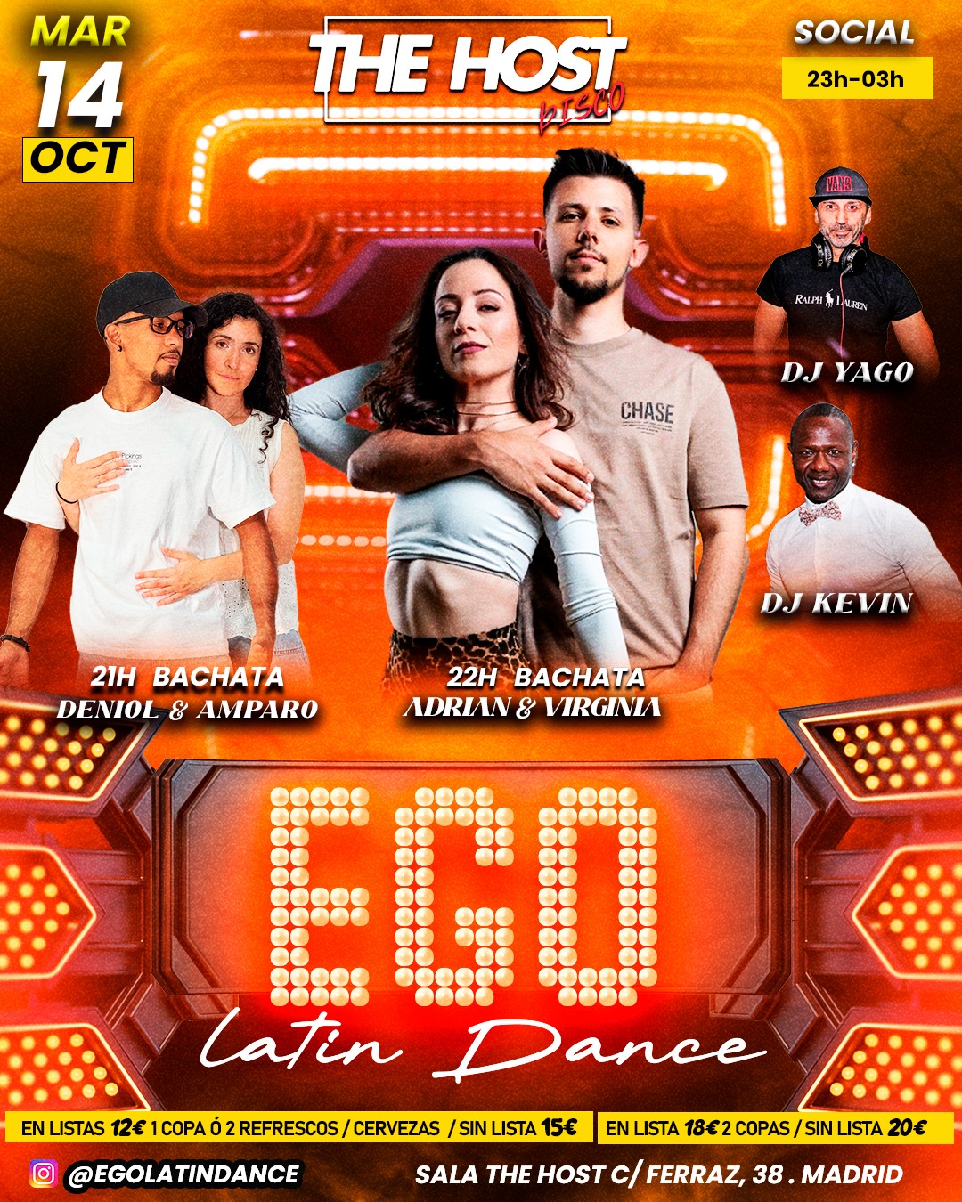 ¿Buscas la mejor sesión de bachata en Madrid para disfrutar, aprender y socializar? El martes 14 de octubre en Sala The Host (C/Ferraz, 38, Madrid) tienes cita obligada con EGO Latin Dance, el evento más recomendado por bailarines y aficionados a la música latina.